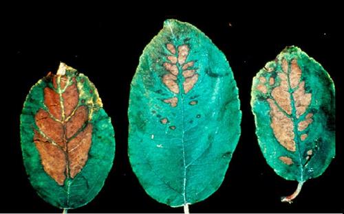 Apple and other fruits sometimes right away develop necrosis without preceding chlorosis.