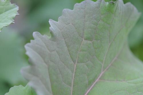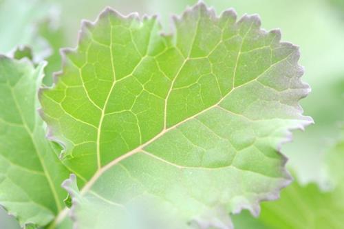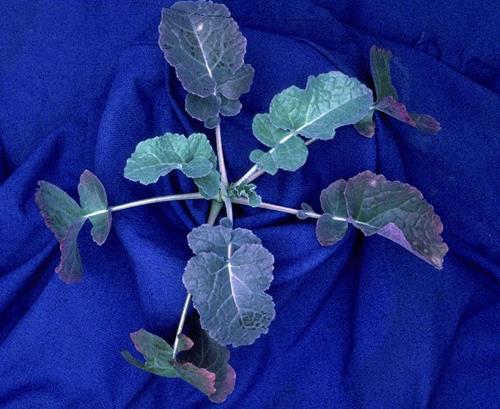The older leaves show a distinct reddish/purple discoloration along the marginal area. The entire leaf blade shos a faint reddish tint.