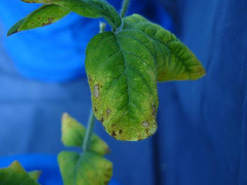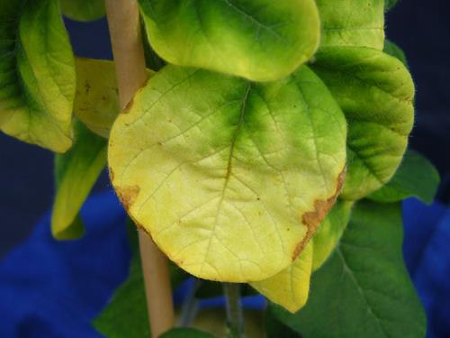 As the chlorosis progresses towards the leaf base, there appear brown necrotic spots in the marginal area.