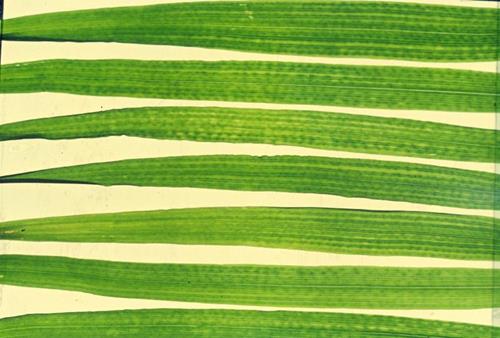 Leaves appear pale green with beading of the chlorophyll. Leaves with more severe Mg deficiency (centre) show leaf margin necrosis.